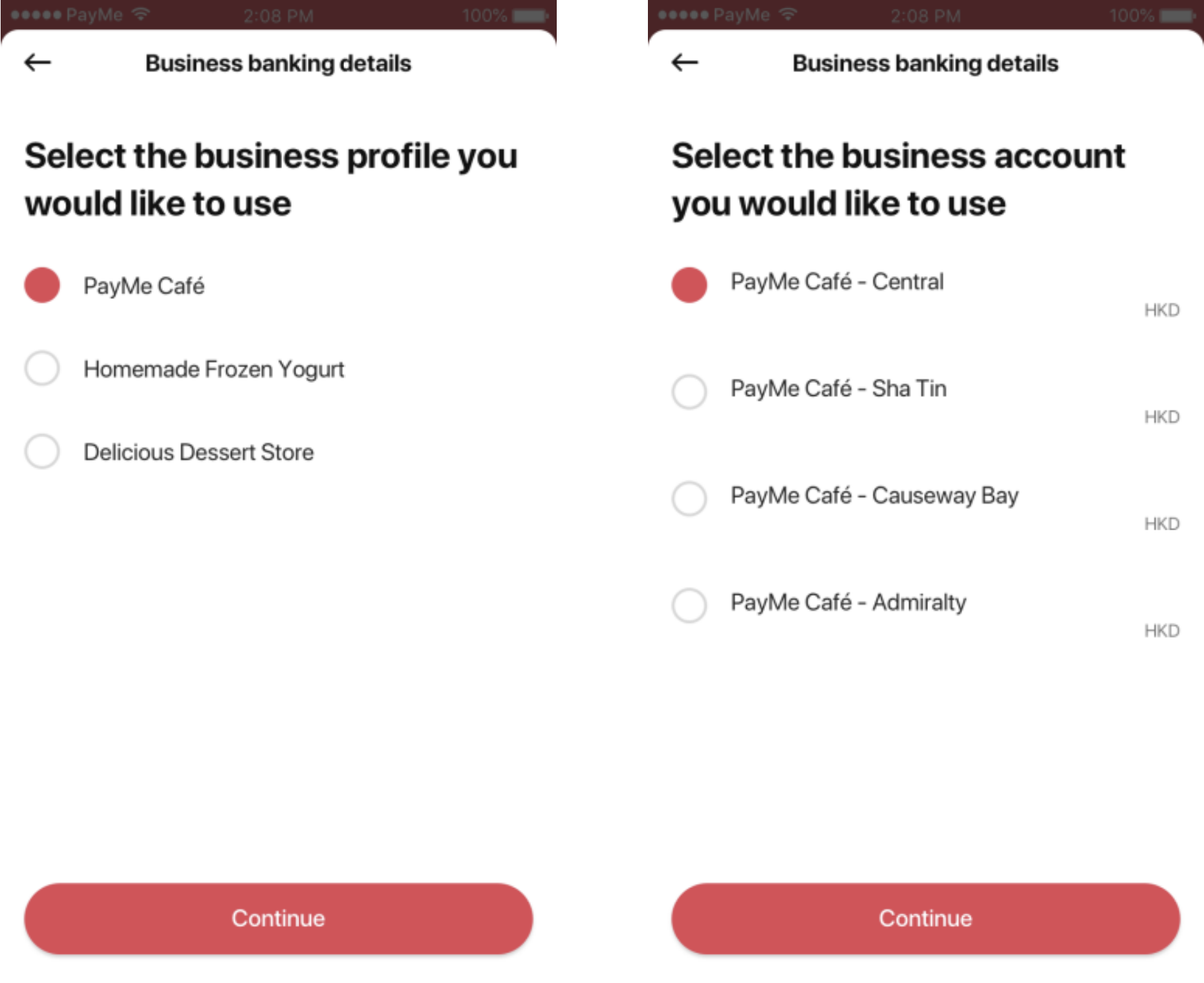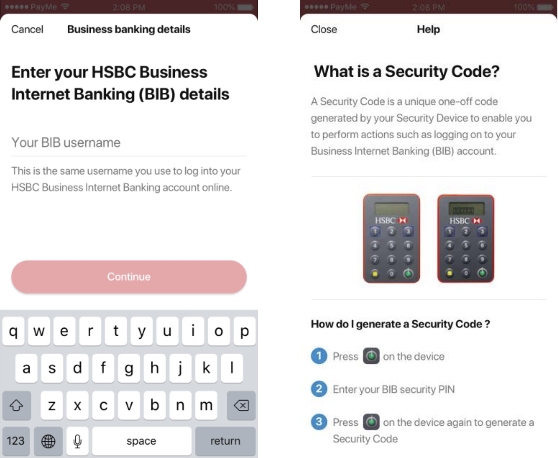 6. Enter your HSBC Business Internet Banking account name, password and security code in accordance with the app's instructions. Finally, select the business account you wish to use with PayMe for Business.