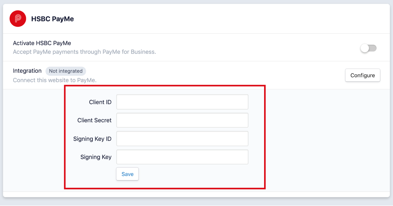 9. Input your Client ID, Client Secret, Signing Key ID and Signing Key that you have requested from PayMe to complete the integration. Please refer to Obtaining activation keys for PayMe for Business.